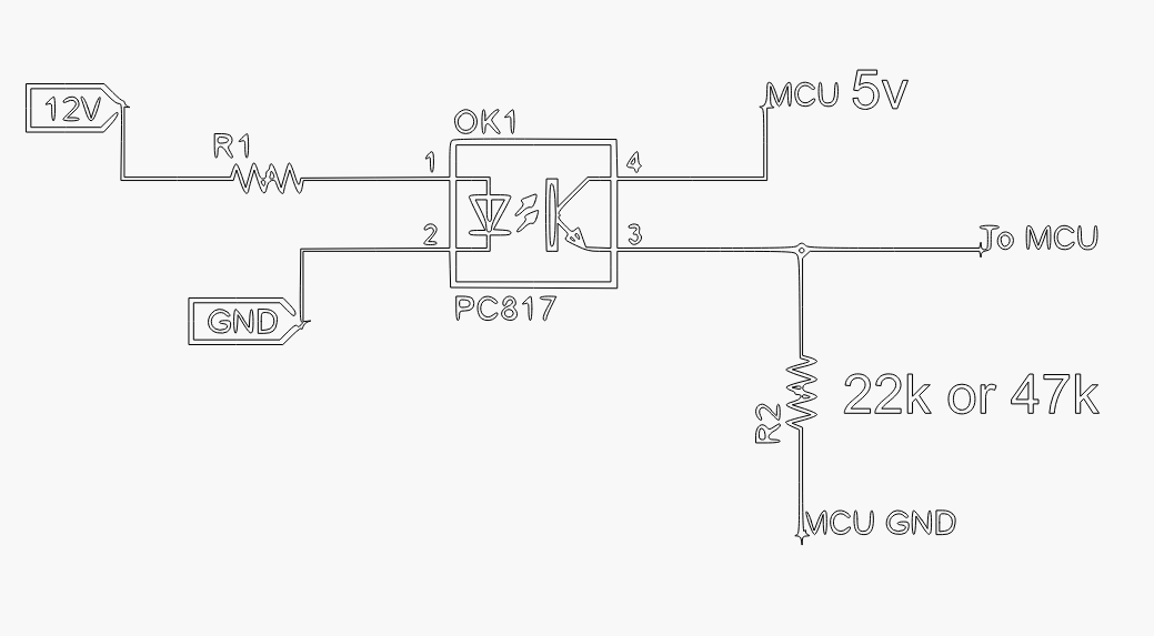 Scusate per la bassa qualità ma non ho programmi di elettronica installati, ho tracciato con lightburn e modificato con i valori. tale configurazione funziona bene con la 3.4.4 ma non con la 3.6.0. se impegno manualmente il finecorsa z ottengo 12v che porto al pin 1 del pc417 tramite resistenza e, quando impegnato, ho il led acceso nel pcb del pc417. dall’altro lato prendo il 5v dal finecorsa (5v) e lo porto all’ingresso 4 del pc417. esce dal pin3 e va al pin gpio34. sempre dal pin3, mediante 22k o 47k (non ricordo esattamente) vado a gnd.