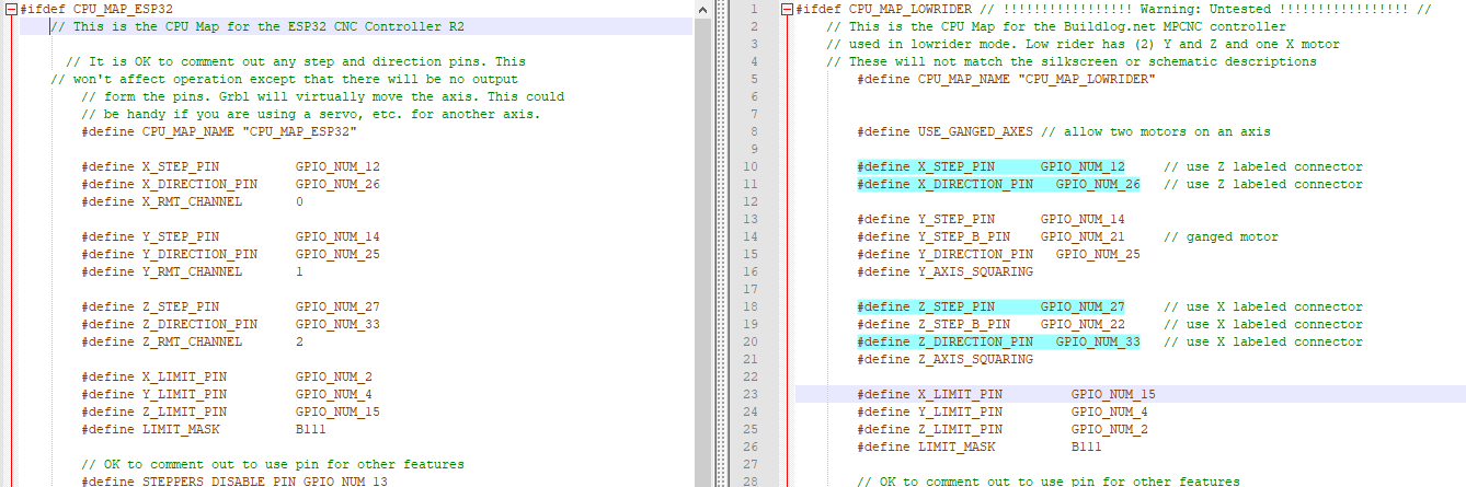Also I see some pins change if I enable CPUMAPLOWRIDER. Can I make some CPUMAPLOWRIDER pins similar to CPUMAPESP32 so that I don’t have to solder up another board? Leaving x, y, and z step and direction pins the same as CPUMAPESP32 would save time. See below.