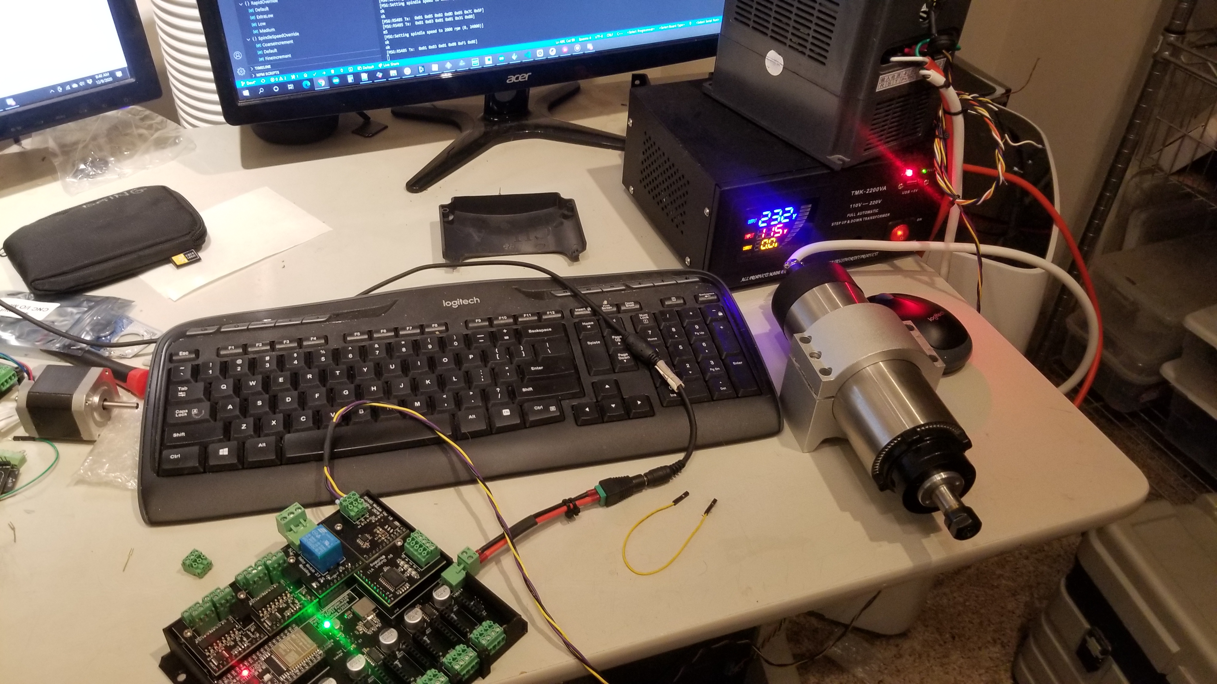 ESP32 on this custom board I mentioned before with the second serial port connected to the RS485 buffer. The buffer is connected to a RS485 to USB serial converter and nothing else. This will mean we won't see a response from the spindle. but I dont think thats going to be an issue - I might be wrong?