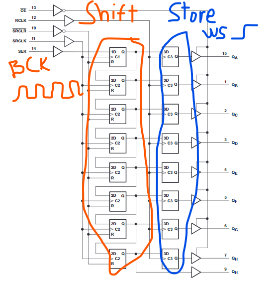 I understand that while WS is LO, the data is taken into 75HC595 at the rising edge of BCK where the value of DATA corresponds to Q0~, and the taken data is reflected in Q0~ at the edge where WS becomes HI.