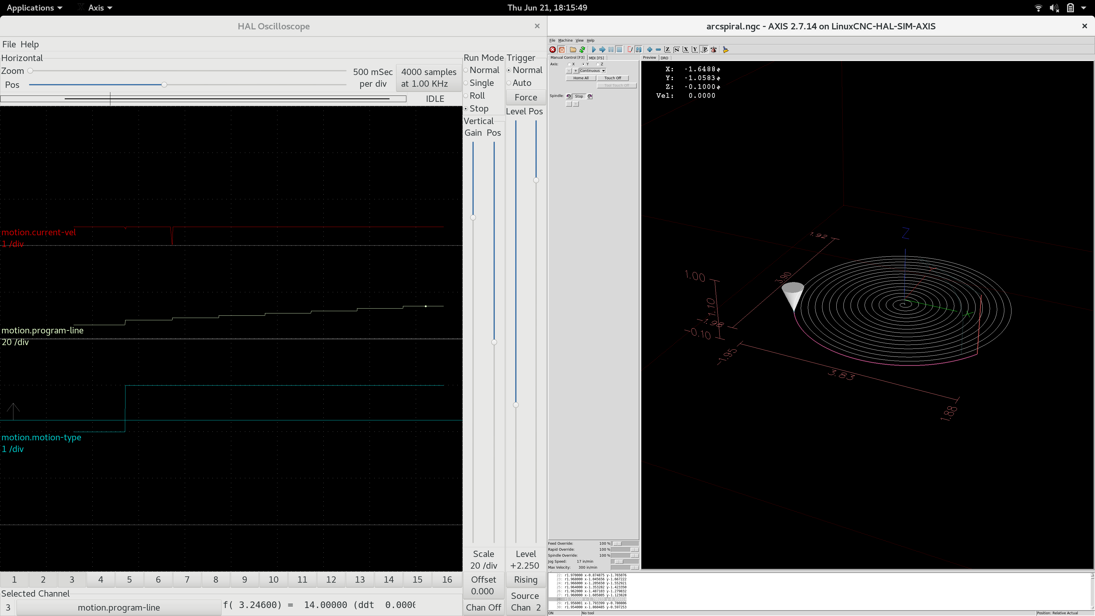 Here’s a halscope trace that shows the same slowdown on an arc-arc transition (from the arcspiral.ngc example included in nc_files).